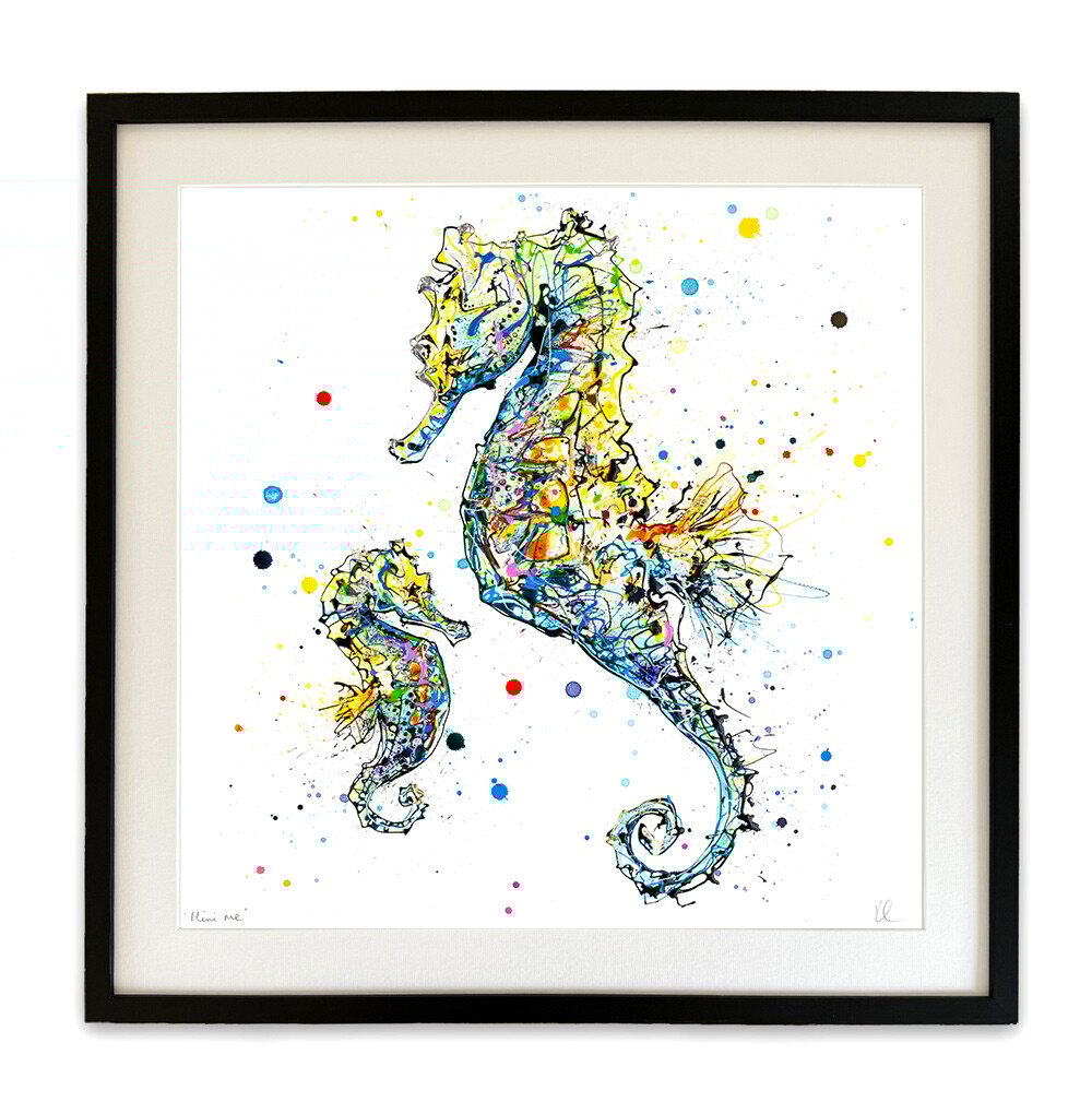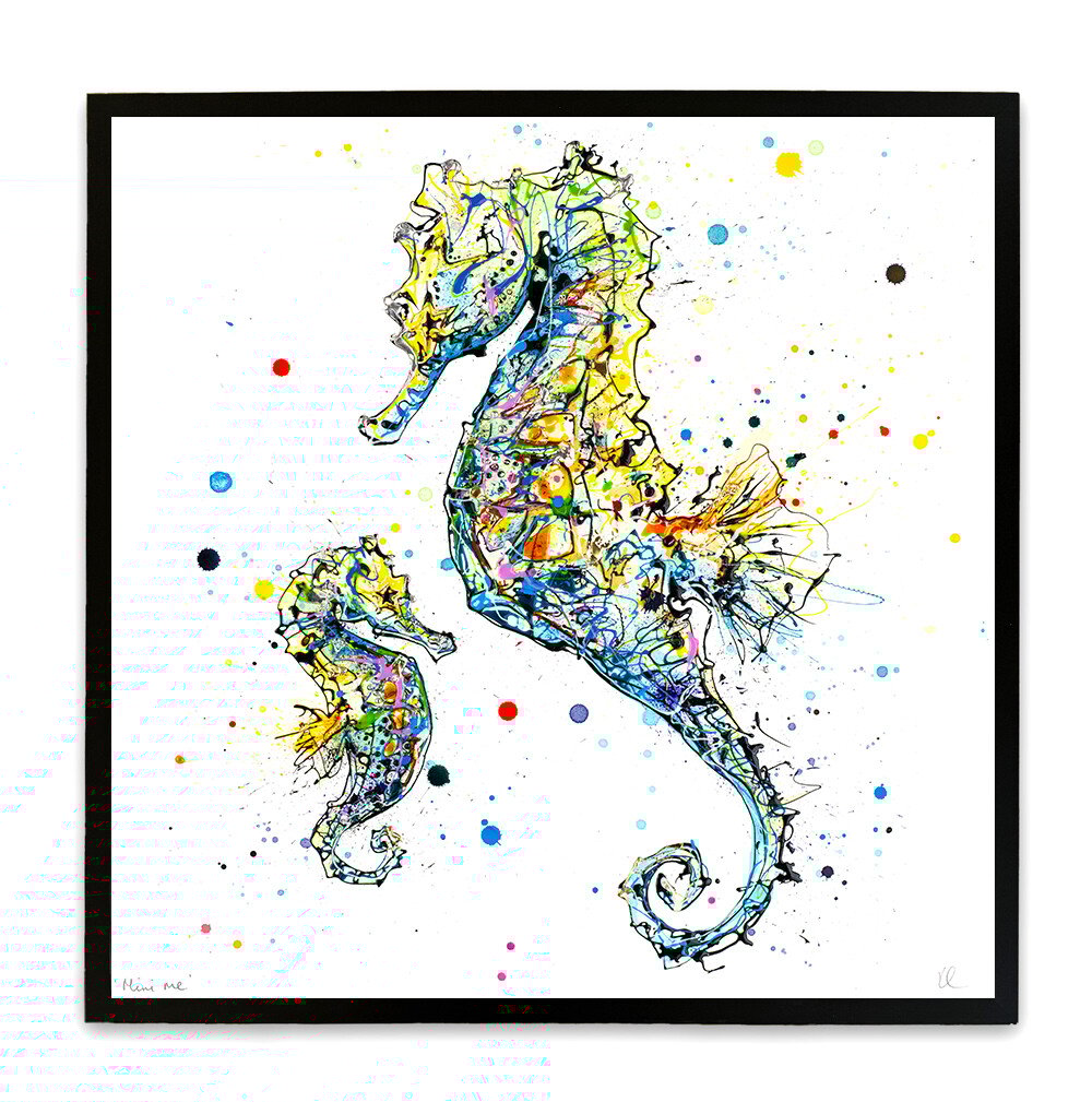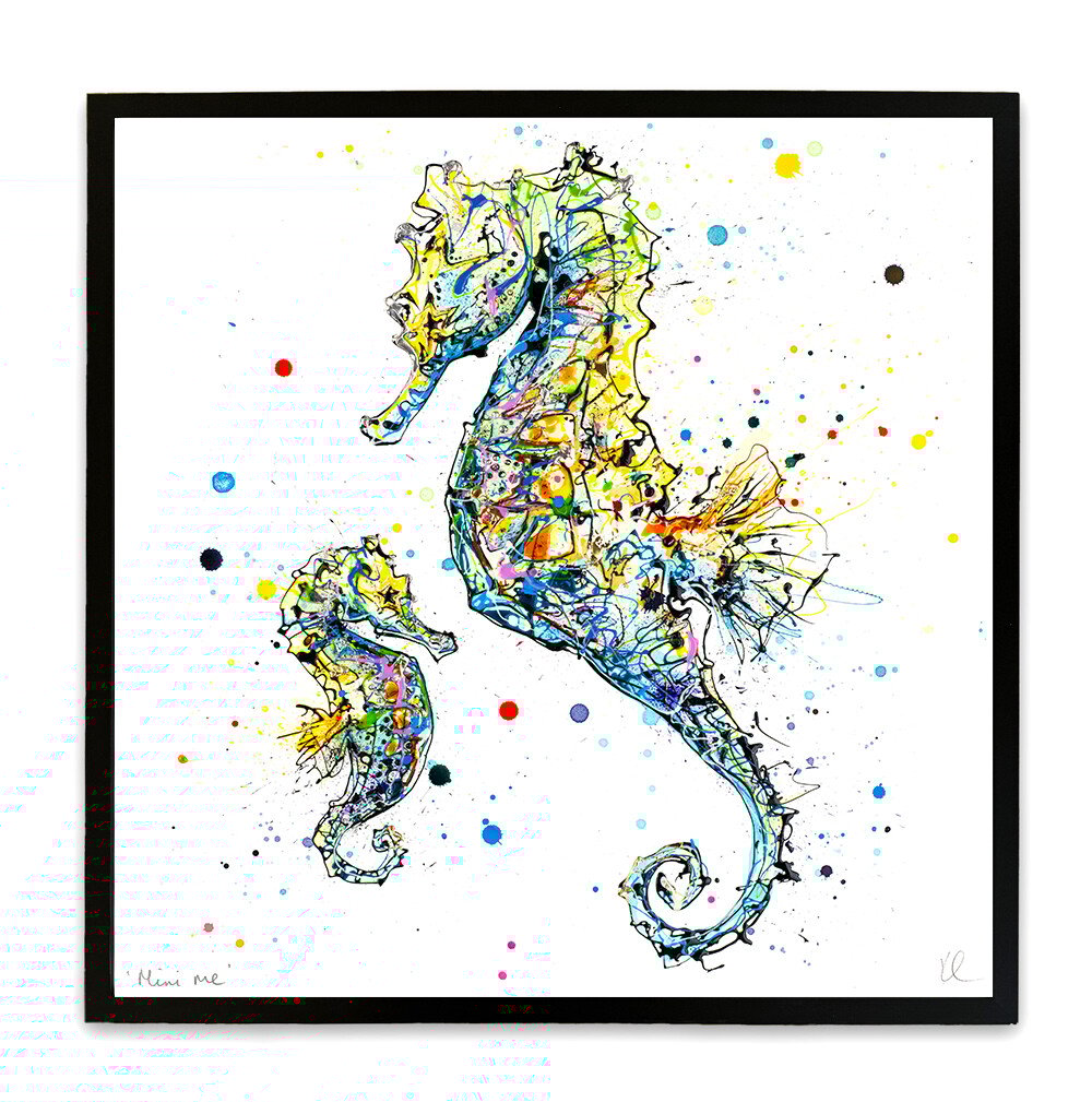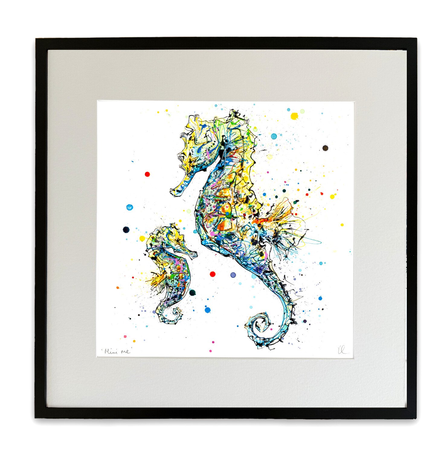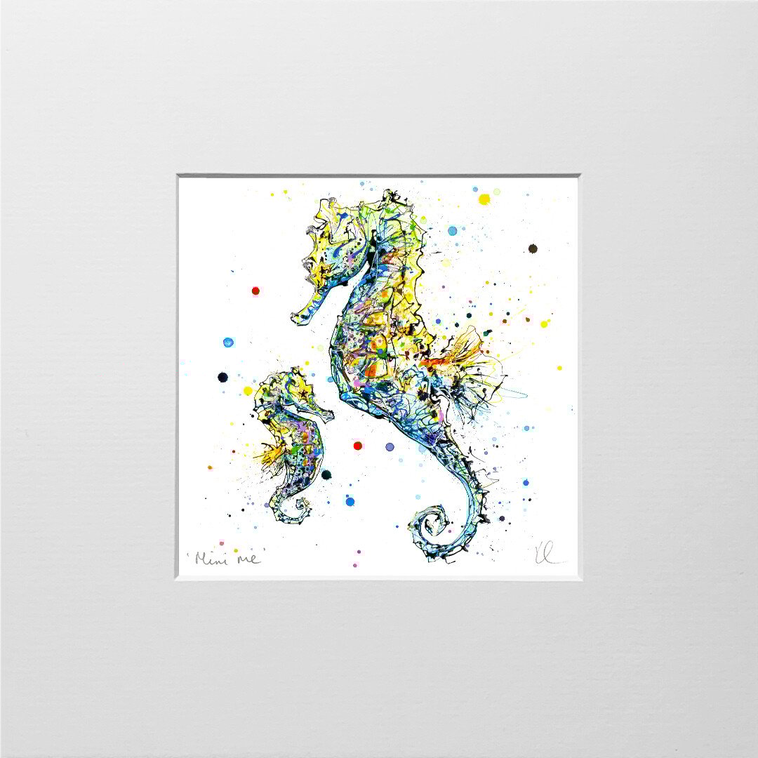 About The Print: This is a print of a parent and baby seahorse bobbing along in the sea. ย Painted with oceanic blues and greens, with a touch of warm orange and yellow, it’s a super cute print that’ll make a gorgeous gift and fit a wide range of rooms from nursery to kitchen, bedroom or bathroom.