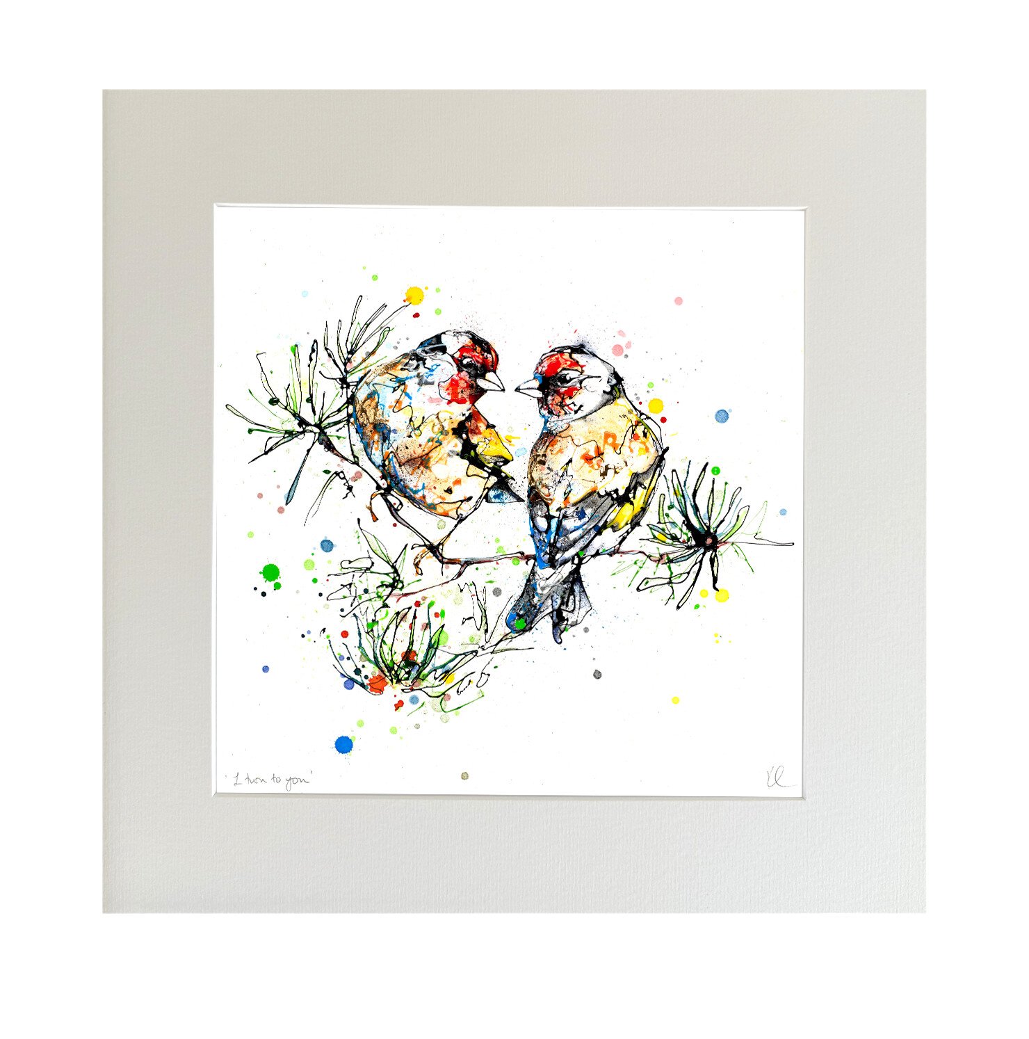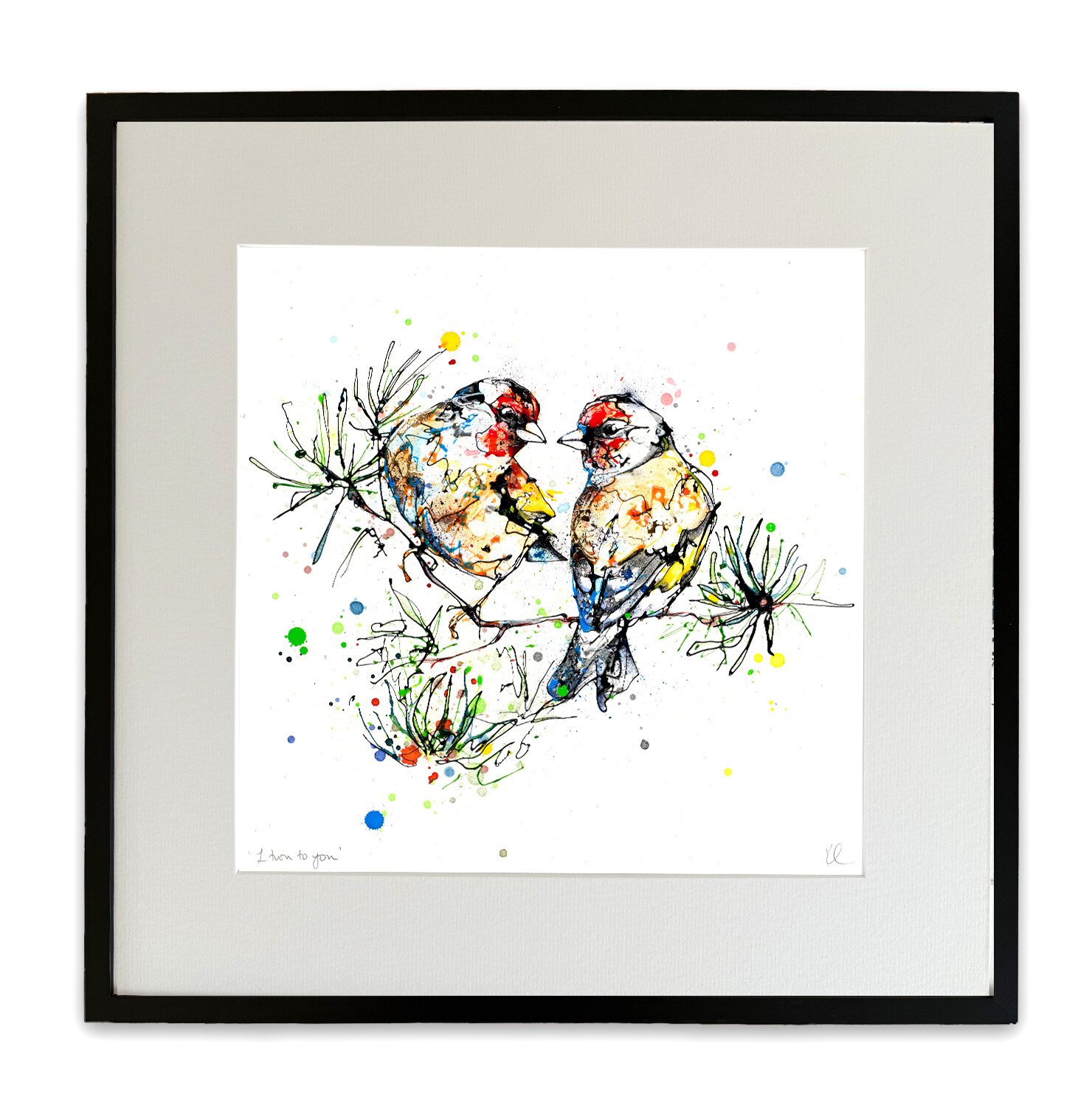 About The Print: This print is designed to symbolise two people on life’s journey together, turning to one another in good times and bad – a beautiful portrayal of two little goldfinch birds.