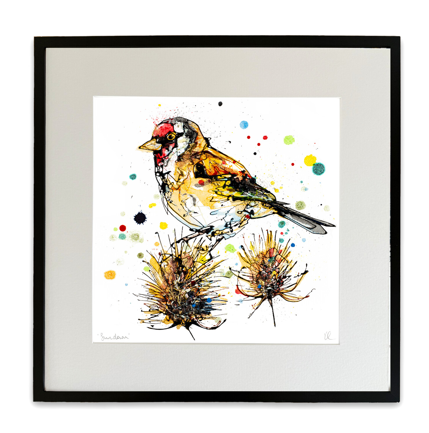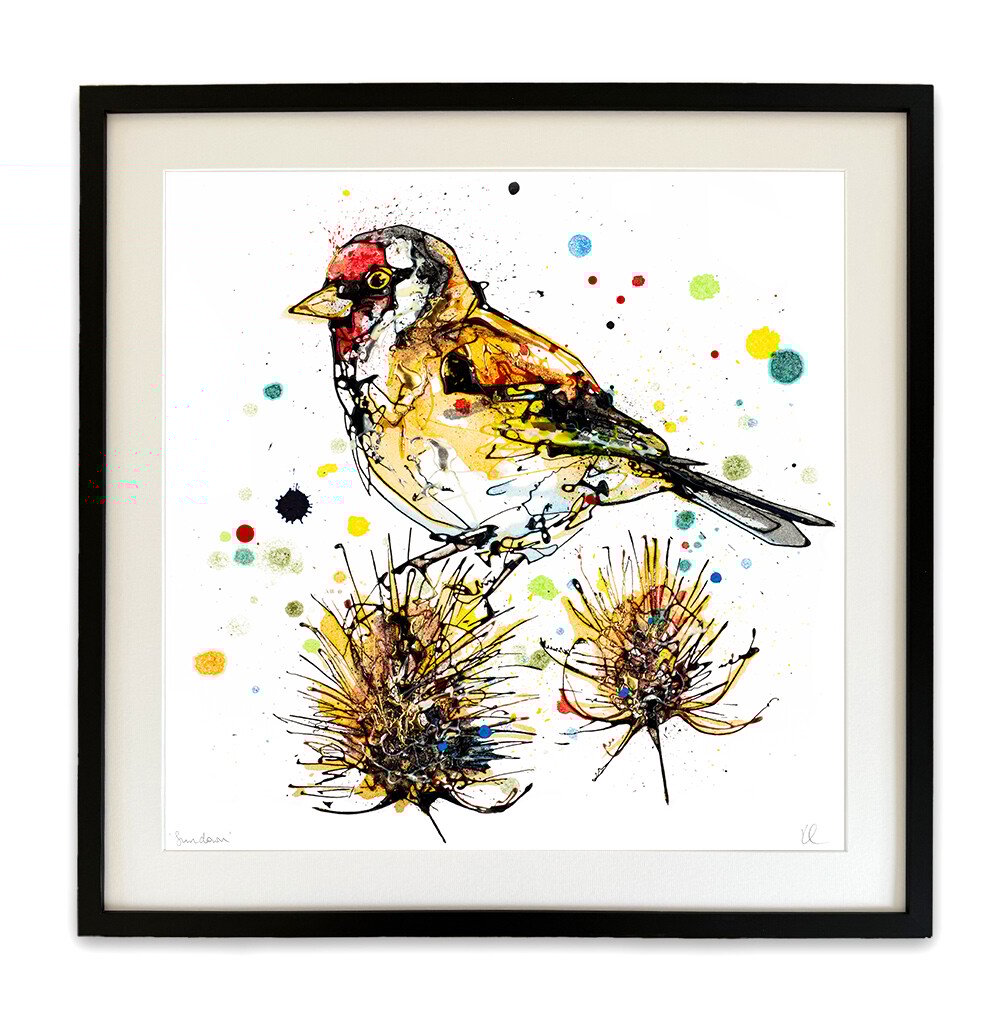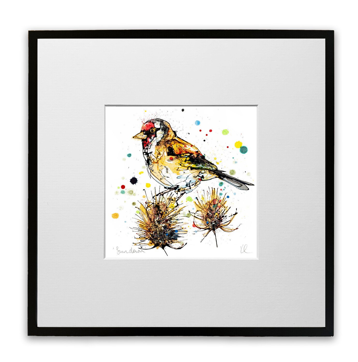 About The Print: This print features a jewel-toned little goldfinch, named ‘Sundown’ for his warm plumage, perched happily on a bristling thistle. You can almost hear his sweet song….