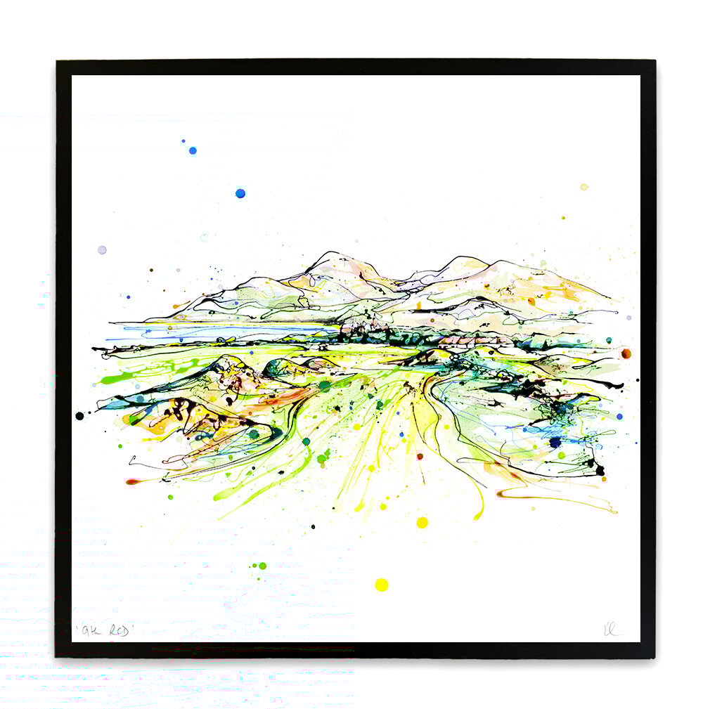 Colours: Sweeping greens lead into dazzling blues, while more colours dapple in the background of this print.