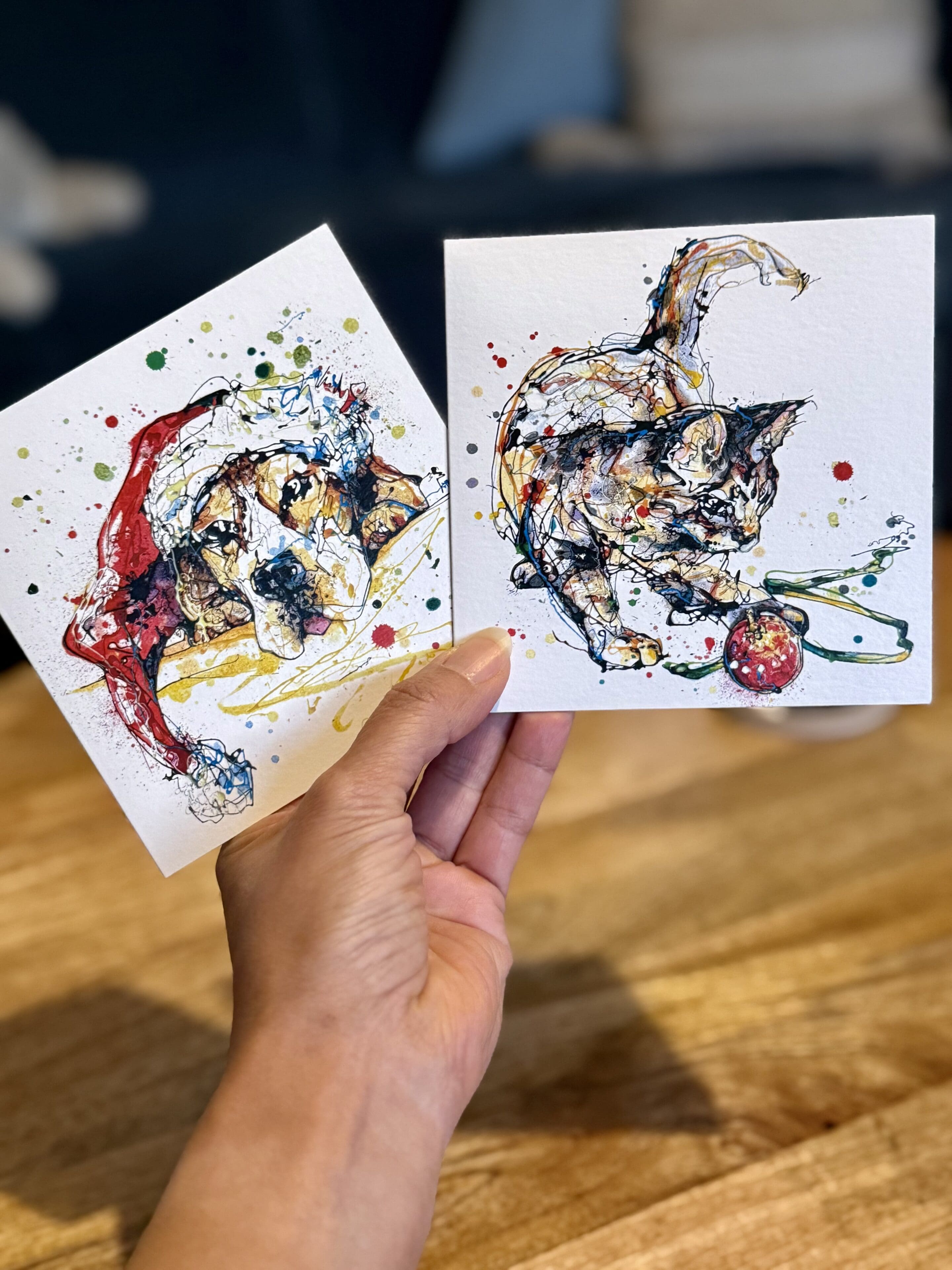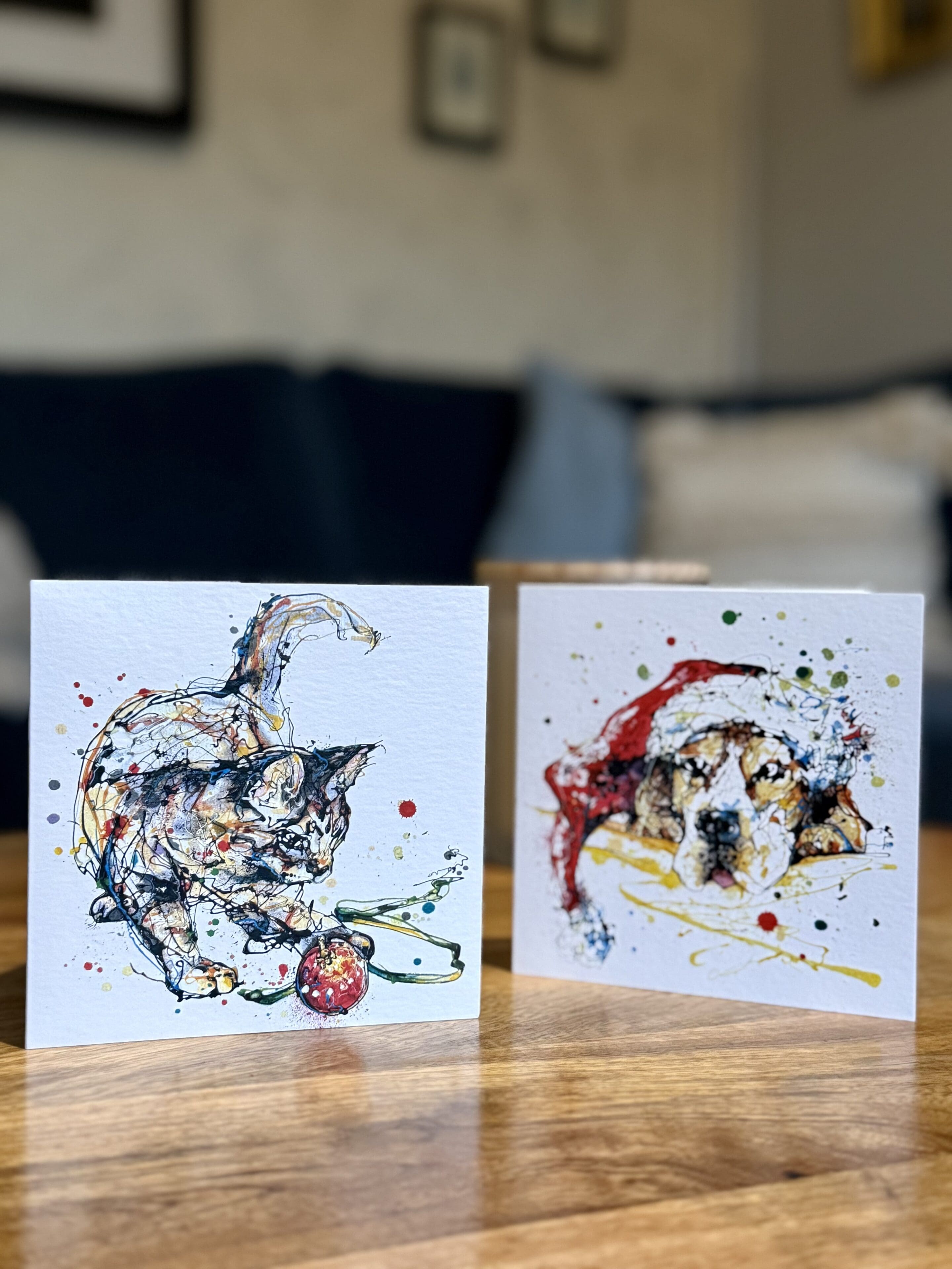 Our little Christmas cat is playful with her festive bauble, while our Christmas pup watches the merriment wearing his Santa hat. Share the Christmas joy this year with a set of these stunning square 12x12cm cards.